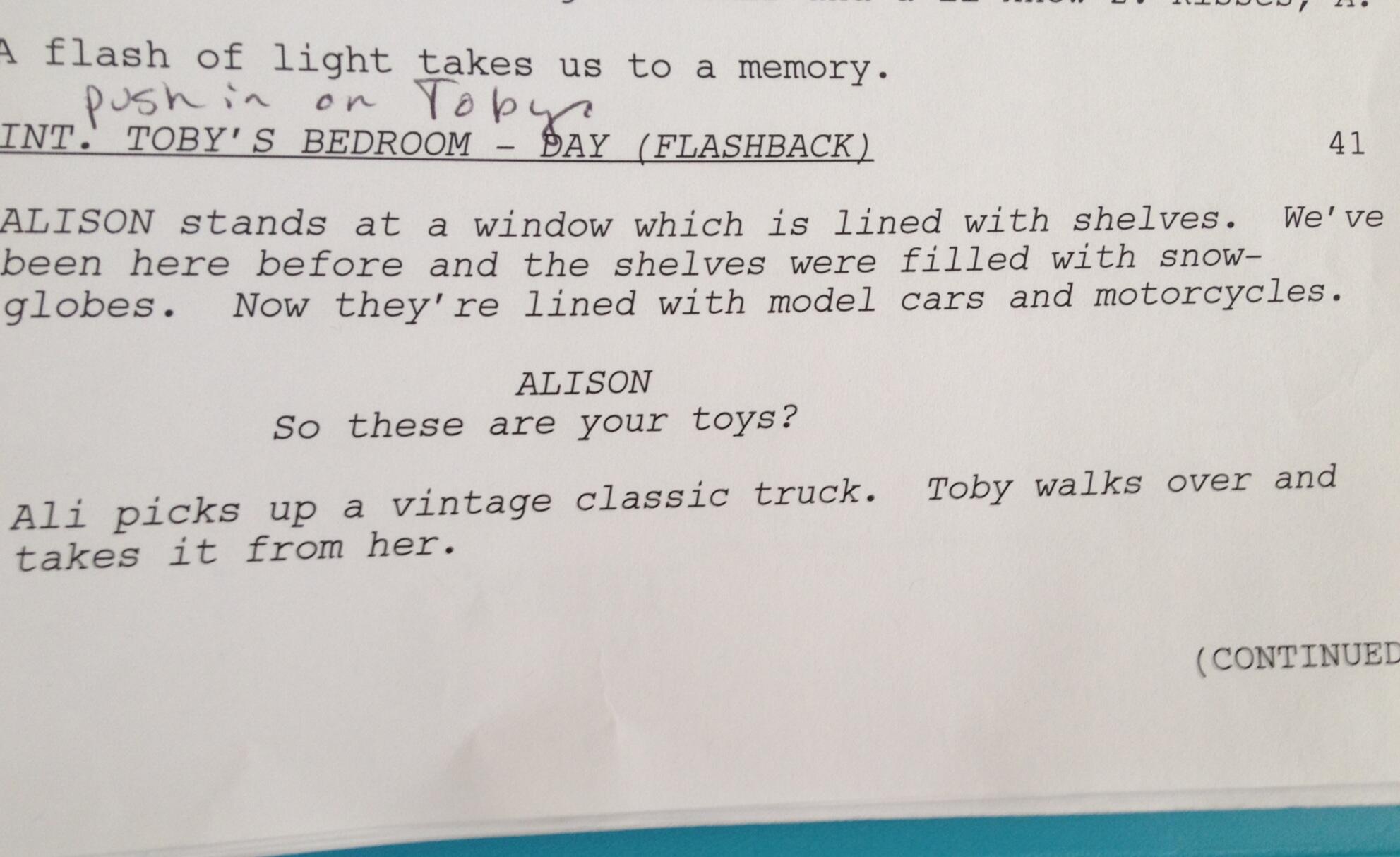 Em contagem decrescente para a estreia da 4ª temporada de Pretty Little Liars, Marlene King através do seu twitter deu um pequeno presente aos fãs, um excerto de um guião onde podemos constatar que se trata de um flashback entre Toby e Alison.